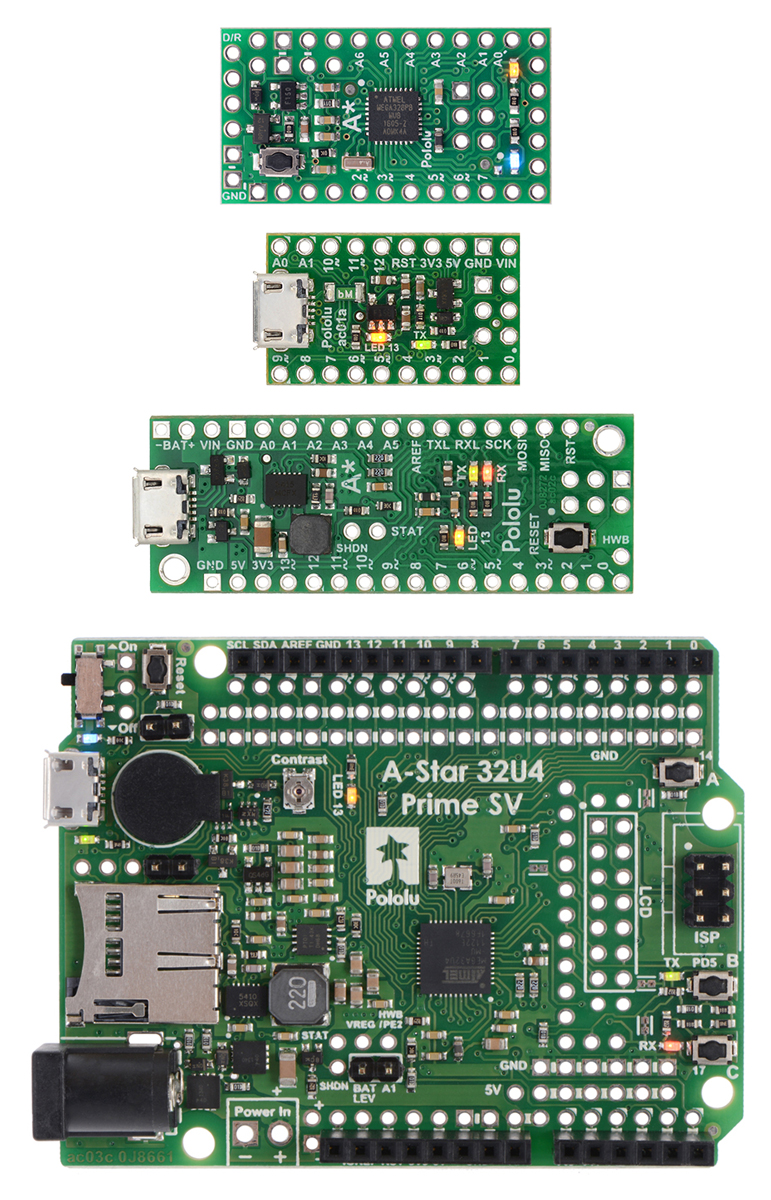 From top to bottom: A-Star 328PB Micro, 32U4 Micro, 32U4 Mini SV, and 32U4 Prime SV. |