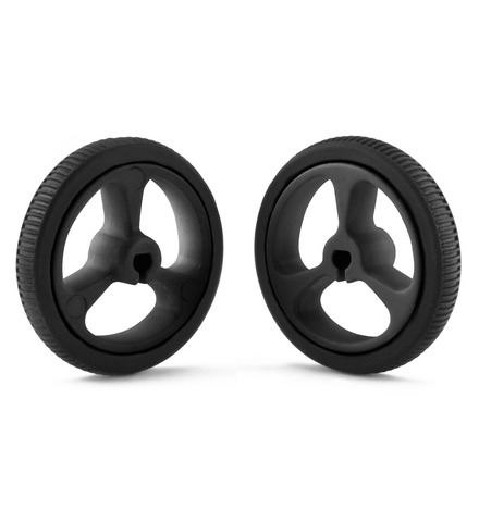These black plastic wheels have silicone tires and measure 32 mm (1.26″) in diameter, and they press-fit onto the 3mm D shafts on many of our motors, including our micro metal gearmotors and our mini plastic gearmotors. This product is a pair of wheels.