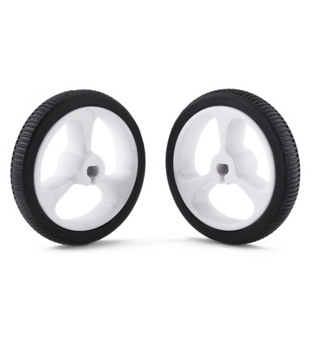 These white plastic wheels have silicone tires and measure 32 mm (1.26″) in diameter. They press-fit onto the 3mm D shafts on many of our motors, including our micro metal gearmotors and our mini plastic gearmotors, to make a nice drive solution for small robots. They are sold in pairs.
