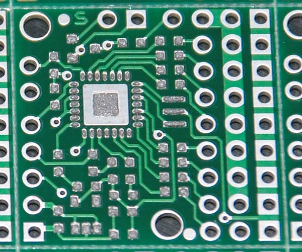 Close-up view of a circuit board with solder paste printed using a mylar stencil. |
