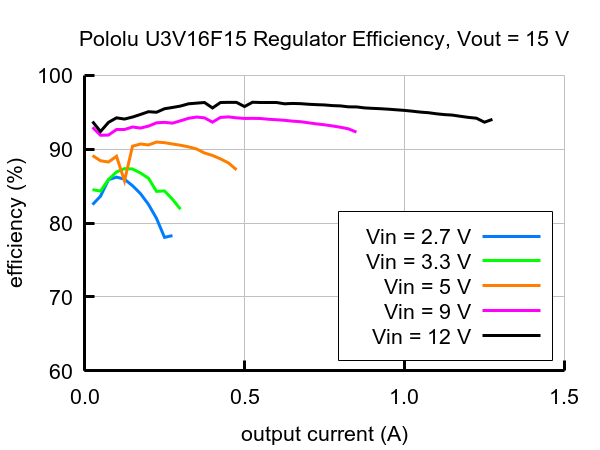 The regulators actively limit the instantaneous input currents to 2 A when boosting, and input currents up to around 1.6 A can typically be maintained for many minutes without triggering thermal shutdown, though the actual performance depends on the input and output voltages as well as external factors such as ambient temperature and airflow. For boost regulators, the output current equals the input current times the efficiency divided by the boost ratio of VOUT to VIN, so the more you are boosting, the lower the maximum output current will be (see the maximum continuous output current section below for performance graphs).