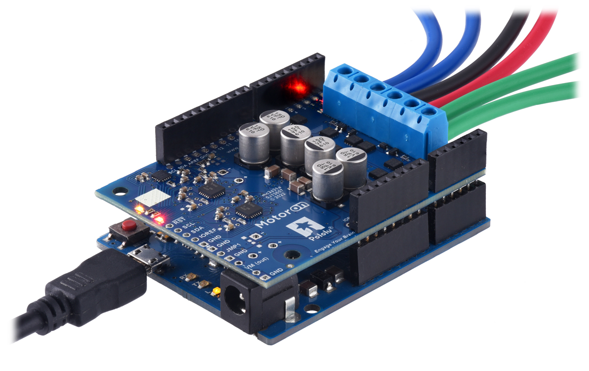 Warning: This motor driver has no over-temperature shut-off. An over-temperature or over-current condition can cause permanent damage to the motor driver. You might consider using either the shield’s current sense or an external current sensor to monitor your current draw.