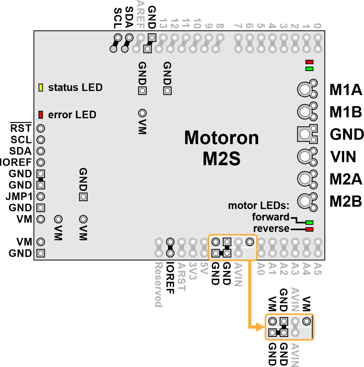 Motoron M2S Dual High-Power Motor Controller Shield pinout. |