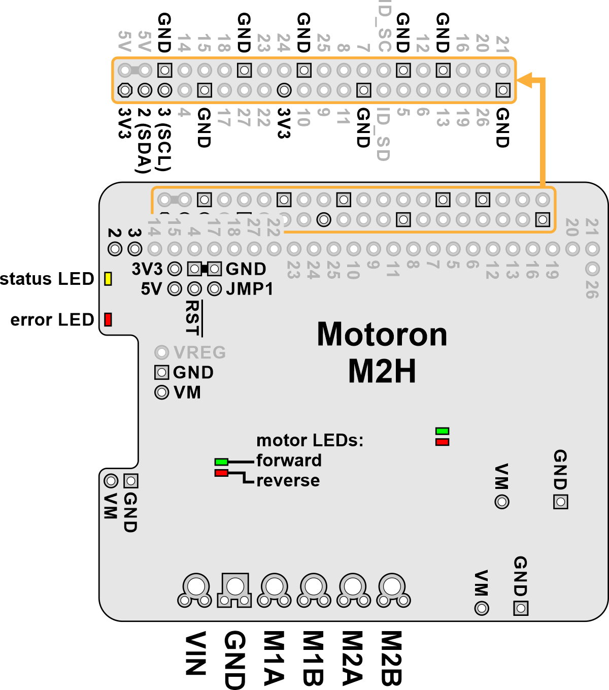 Motoron M2H Dual High-Power Motor Controller for Raspberry Pi pinout. |