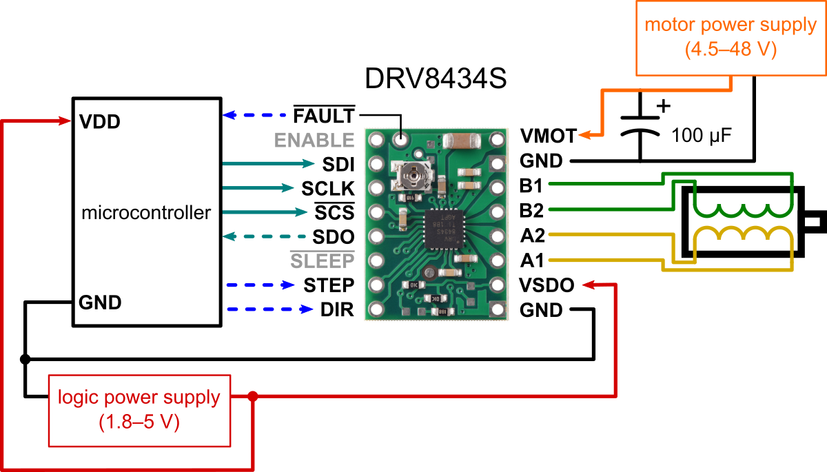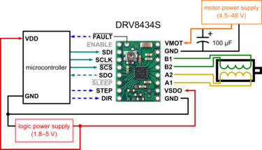 Typical wiring diagram for connecting a microcontroller to a DRV8434S stepper motor driver carrier.