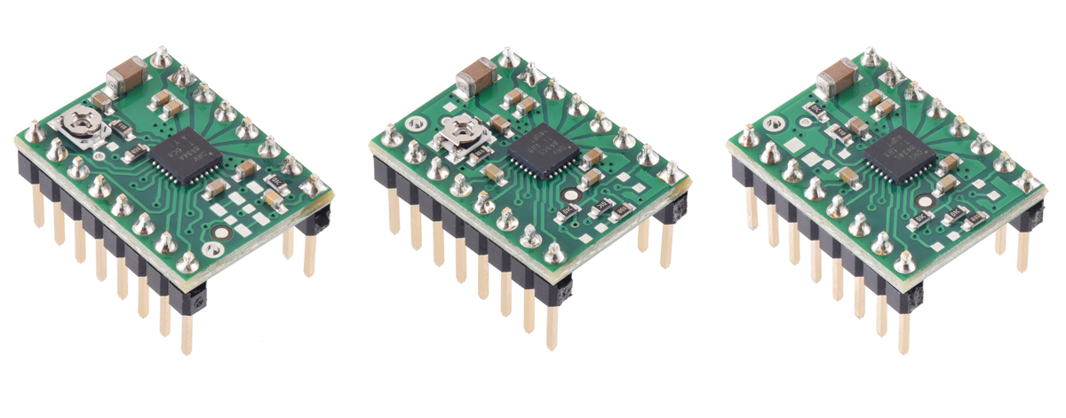 Our selection of compact stepper motor driver carriers is expanding with the addition of three new boards based on the DRV8434A and DRV8434S from Texas Instruments. They feature stall detection, adjustable current limiting, over-current and over-temperature protection, and 11 microstep resolutions (down to 1/256-step). They operate from 4.5 V to 48 V and can deliver approximately 1.2 A continuous per phase without a heat sink (up to 2 A peak). The DRV8434A version uses a standard GPIO interface for configuring microstepping and stall detection and a potentiometer for setting the current limit, while the DRV8434S versions use SPI to configure microstepping, stall detection, decay modes, and the effective current limit.