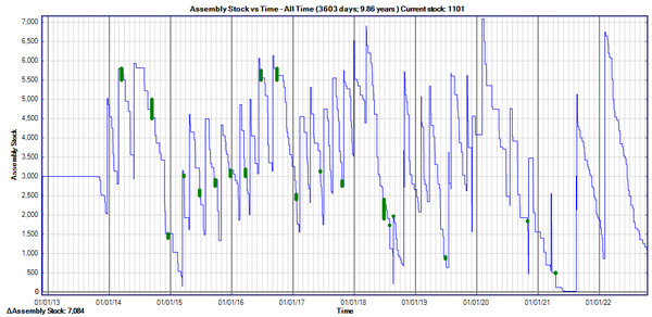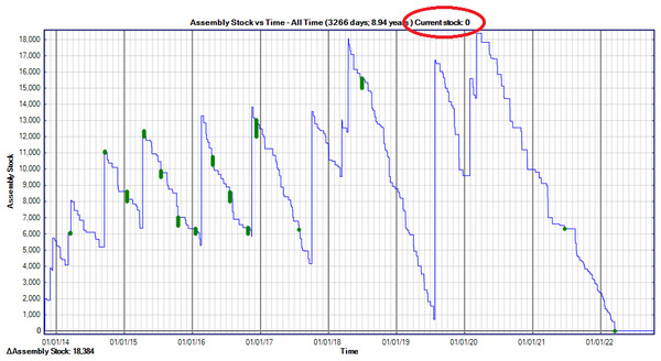 In the case of one important part I mentioned last year, we are still waiting for an order placed in late 2020 without having received anything since a partial shipment in March 2021! Here is what our internal stock chart looks like for that component: