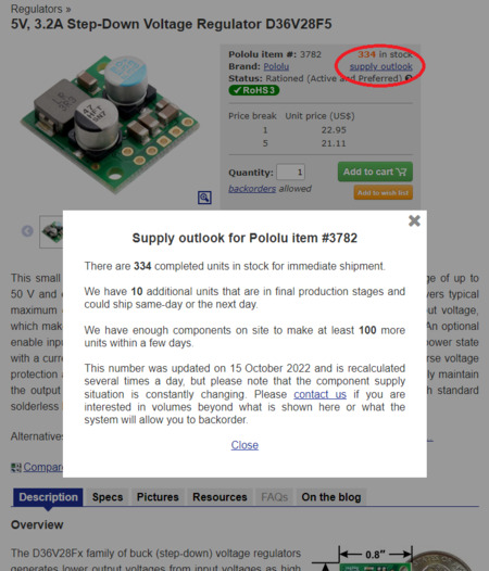 One big downside of reduced ready-to-sell inventory is that it’s difficult for customers to tell what is really, really unavailable because we’ve been out of parts for a year and what is actually available as soon as we make some more. To give you some automated guidance, we introduced a “supply outlook” feature to our website. Here is how that looks at the moment: