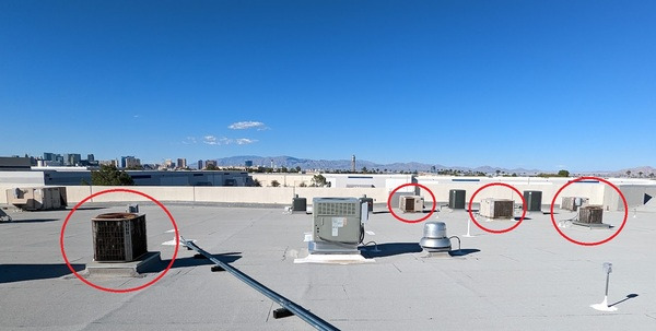 Old ACs on Pololu building roof, waiting for replacement. Las Vegas Strip in the background.
