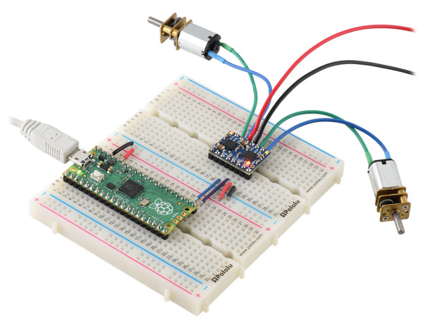 A Raspberry Pi Pico on a breadboard using a Motoron M2T256/M2U256 Dual Motor Controller to control two motors.