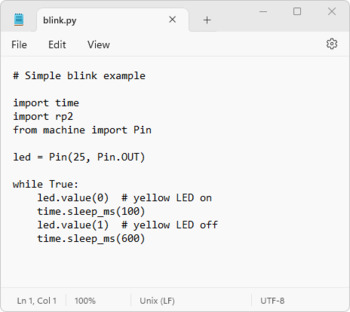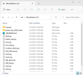 That brings us to the new 3pi+ 2040, powered by the Raspberry Pi RP2040 microcontroller (32-bit dual-core Arm Cortex-M0+) with 16 MB (128 Mbit) of flash memory. The robot ships preloaded with a MicroPython interpreter, so you can get started right away by plugging into its USB C port and editing the included example Python programs with your favorite text editor. No special programmers or programming software are required, and you can write MicroPython code from practically any desktop or mobile operating system as long as it has a text editor and the ability to copy files to a USB drive. For a basic Python IDE that lets you run code interactively, we are recommending the Mu editor. (See the User’s Guide for instructions on setting it up.)