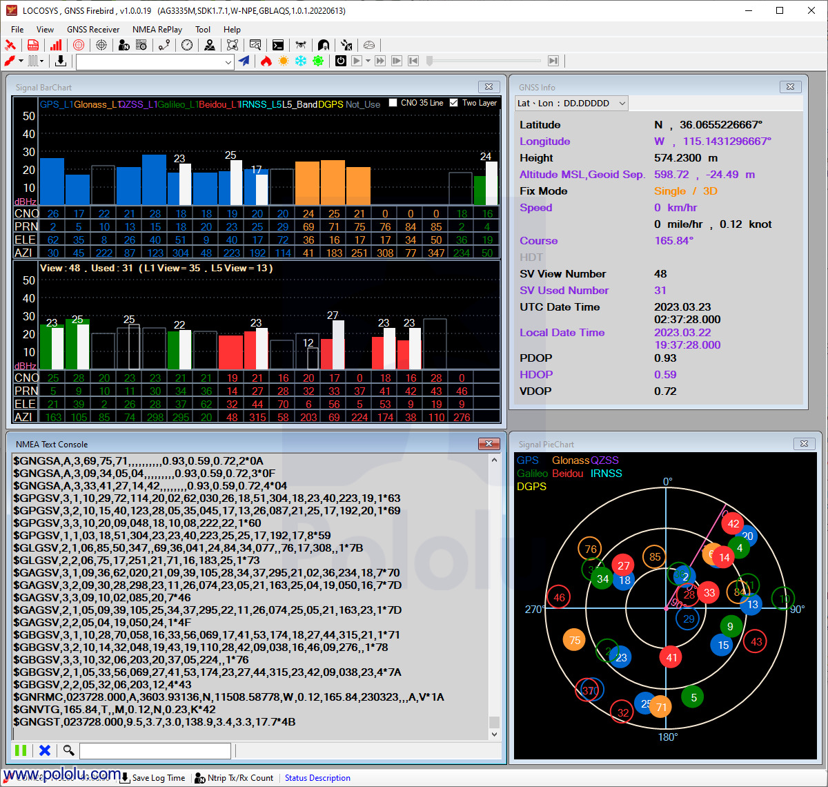 The GNSS Firebird software provided by LOCOSYS can be used to configure the LC20031-V2 and view its output. In this screenshot, you can easily see the different satellite systems that the receiver is tracking, represented by the different colors in the displays (GPS is blue, GLONASS is orange, Galileo is green, and BeiDou is red).