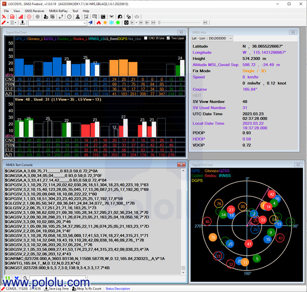 GNSS Firebird application showing data from an LC20031-V2 module inside Pololu’s offices.