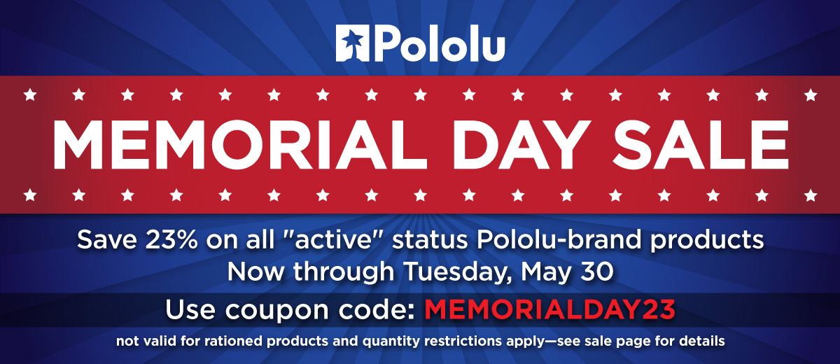 If you have followed the electronics industry or even general news, you’ll know that for the past several years we’ve been dealing with parts shortages, rationing, and associated price increases. We are relieved to finally be getting net increases in parts on hand! In the past few months we have taken hundreds of products off rationing, and we are celebrating and highlighting them in our Memorial Day Sale. Use coupon code MEMORIALDAY23 to save 23% on all non-rationed Pololu-brand products with an “Active” or “Active and Preferred” status, limit 5 units per item, now through Tuesday, May 30.