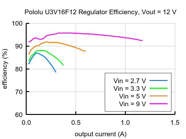 We are excited to introduce our new compact and efficient U3V16Fx family of boost voltage regulators, which can generate higher voltages from input voltages as low as 1.3 V (the minimum startup voltage is 2.7 V, but they will operate down to 1.3 V after that). It’s awesome how much power these deliver in such a tiny package! It’s a little difficult to quickly convey the power or current capabilities of boost converters, since the output power is limited by the input current (which can be up to 2 A with this new family), but we usually care about the output current, which is inversely proportional to the ratio by which you are boosting the voltage. For instance, if you are tripling your voltage from 3 V to 9 V, the maximum possible output current would be one third of that 2 A maximum input (assuming 100% efficiency). Continuous currents will be a little lower than peaks, and once you factor in real world efficiency (typically 80-95%), you can expect these kinds of maximum currents: