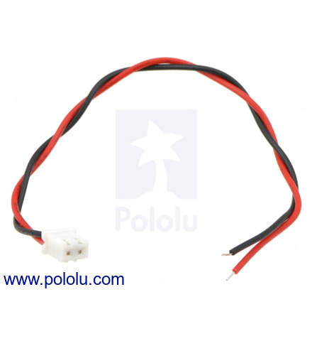 This 5.5" (14cm) cable has two 26AWG conductors with a 2mm-pitch 2-pin female JST PH-style connector. The other ends of the wires are unterminated; they can be cut to length to match your application. The red and black wires are twisted together to reduce noise.