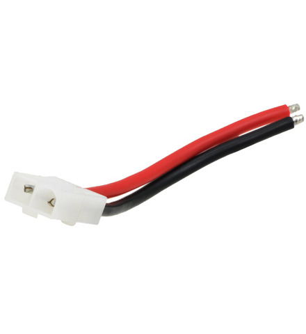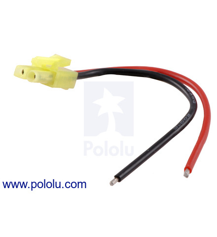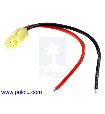 This connector, a smaller version of the female Tamiya plug, is commonly used with battery packs for RC applications. The connector is keyed so that power cannot be reversed, and a latch secures the connection so that it will not become disconnected. This female mini Tamiya connector has 10 cm 18-AWG leads with stripped and tinned terminations.