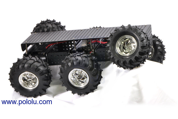 These rugged chassis from Dagu Electronics have independent suspension for each of their spiked 120mm-diameter wheels, allowing exceptional traction over uneven terrain, and their bodies are made from 2mm-thick anodized aluminum with a 10mm-pitch grid of 4mm holes, making it easy to mount electronics and accessories to the chassis.
