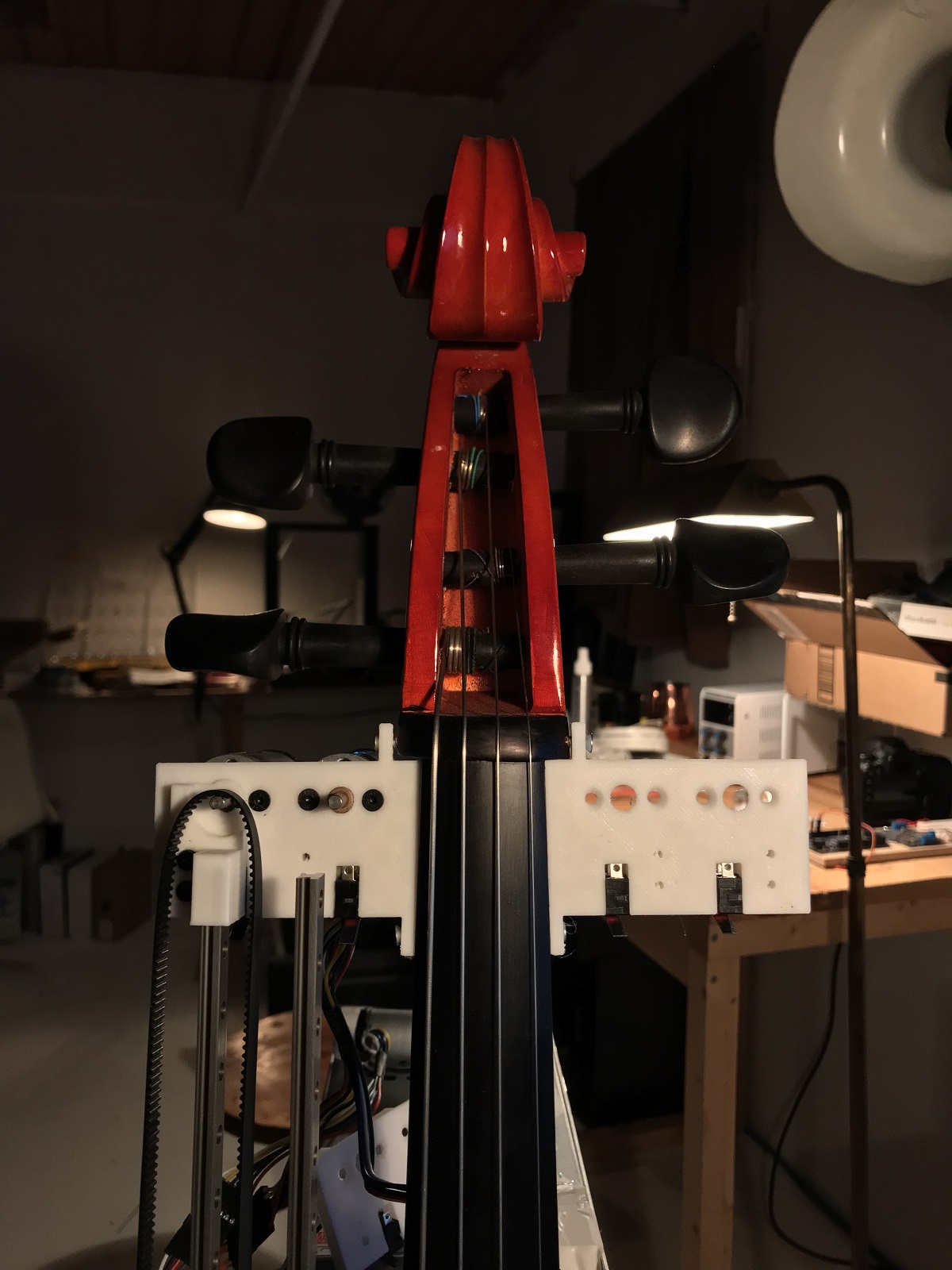 Yes, I designed the whole robotic system from scratch. The cello is such a beautiful instrument in both design and sound. However it is designed specifically for a human body, none of the strings are parallel or in the same plane even, they all diverge towards the bridge. I didn’t want to change the actual instrument in any way for this project. This complicated the build a lot! On top of that, no two instruments are the same, so I had to make sure that the parts could be adjusted in the different planes depending on the instrument they were attached to. Another difficulty is at the top end of the finger board the strings are very close together meaning the sliders all had to be very thin so as not to collide with each other. In the end all these considerations led me to the decision that I would 3D print all the parts. With such a short build timeline, this meant I could design and print revisions of all the parts much quicker than if I was making all the parts by hand in the workshop.