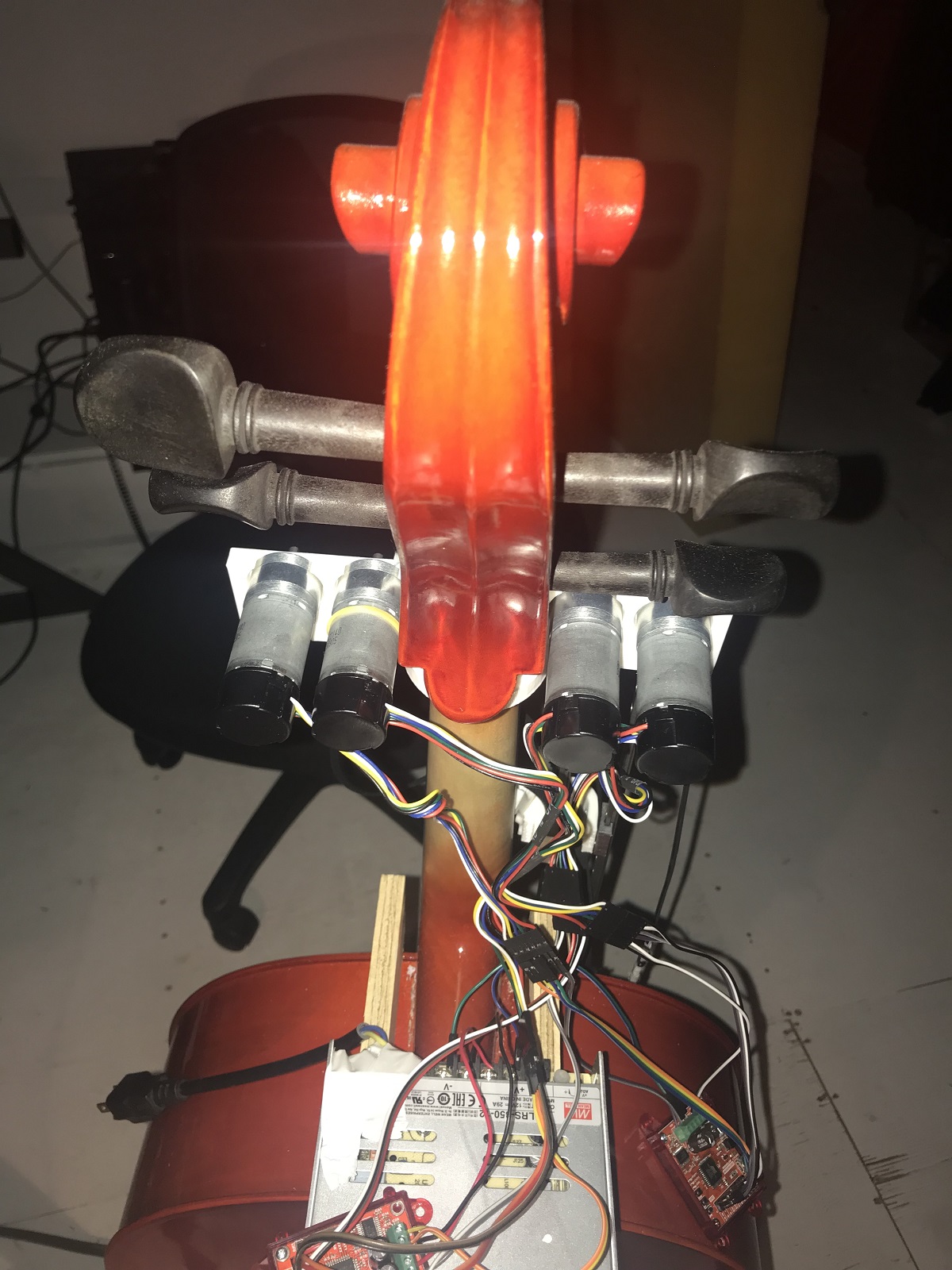 That is funny. Yes, originally I was using your 4.4:1 gear ratio 12 V motors as I really wanted the note sliders to be whizzing up and down the fingerboards like a cello maestro. But after burning out some of the motors by driving them too hard, I decided to switch to the next gear ratio down (and actually even they were getting hot). But by this point I had already locked off the design and ordered all the motors as the opening night for the piece was in three weeks. So to make sure I didn’t lose any more motors, I added some forced air cooling (just a silent fan sat on a bar stool pointed at the motors of each cello)… it added a slight bit of rock ‘n’ roll to the show.