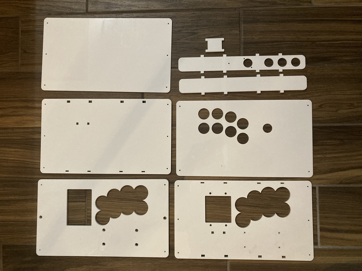 I built an arcade joystick case using acrylic parts (3mm and 6mm thickness) that I made with our Custom Laser Cutting Service as well as various M-F standoffs, F-F standoffs and screws and nuts.