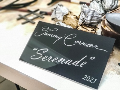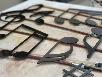 The music notes were laser cut out of black cast acrylic, which we stock regularly. The title sign for the piece, pictured below, was cut from the same material and raster engraved. A nice feature of the cast acrylic used in this piece is that it turns frosty white when engraved, which provides high contrast engravings.