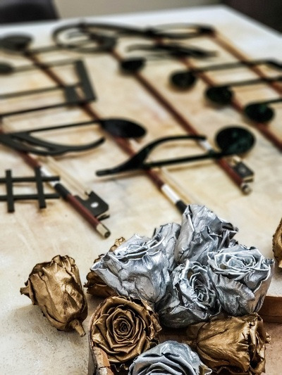 The piano-glossy notes, the authentic violin bows and an actual violin, the laser-cut butterflies, the preserved roses – each element brings a different sensation and a different meaning.