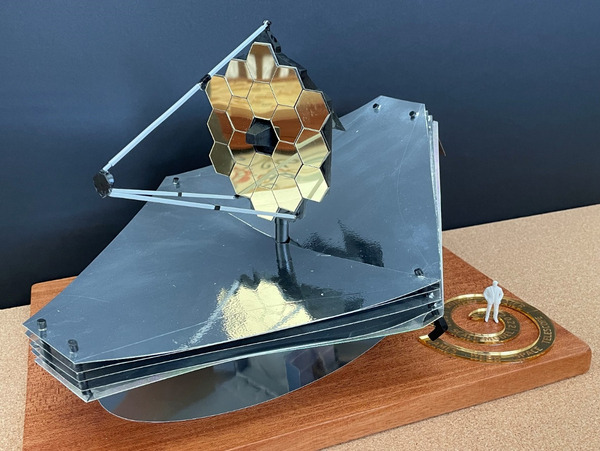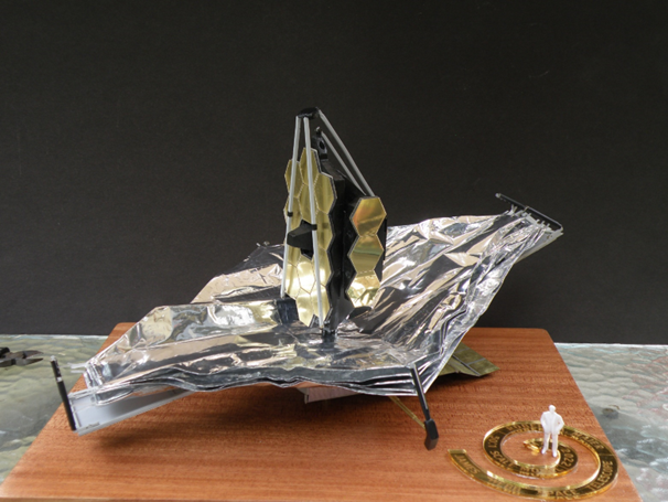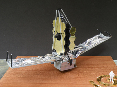 JWST model, partially unfolded, with plastic figure to show 50:1 scale.