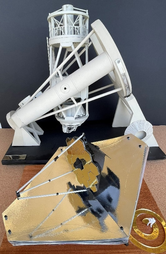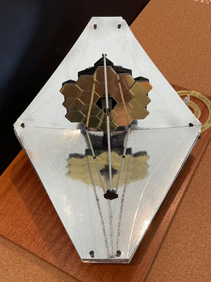 50:1 scale model of the James Web Space Telescope model with laser-cut and etched gold-mirror acrylic and gold-mirror styrene parts.