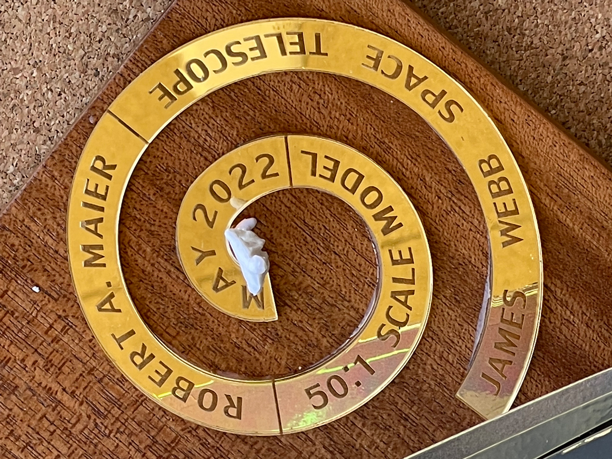 Spiral label for a JWST model, laser cut end engraved on 3 mm gold mirror acrylic.