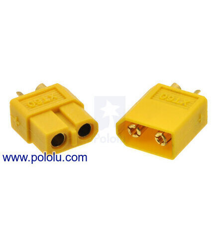 These are high-current XT60 connectors commonly used in the RC hobby industry. They are sold as matching male-female pairs and are great for projects that involve bigger motors and controllers, such as our high-power motor drivers and Simple Motor Controllers.