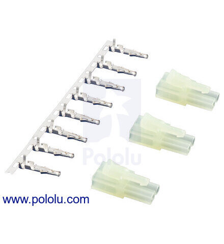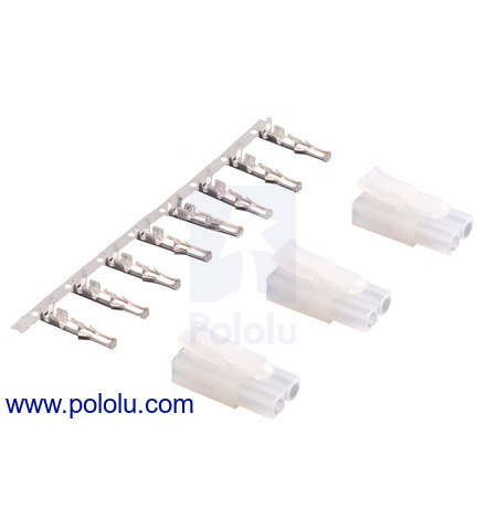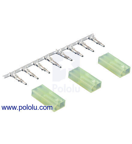 This style of high-current connector is commonly used with the 7.2V sub-C battery packs that power many RC cars. The connector is keyed so that power cannot be reversed, and a latch secures the connection so that it will not become disconnected. You can use a crimping tool to attach these connectors to your own 14- to 20-AWG wires. This pack contains enough housings and crimp pins (including two spare pins) for 3 male connectors.