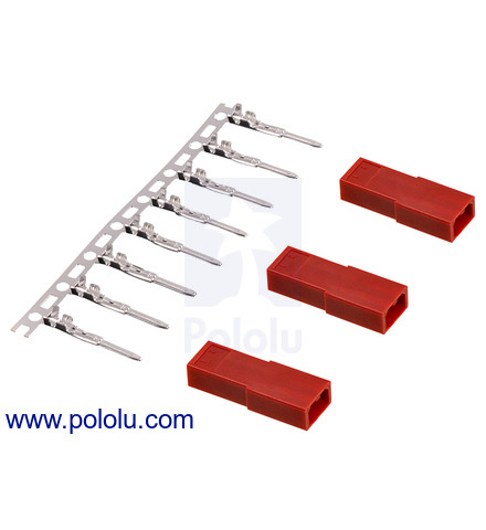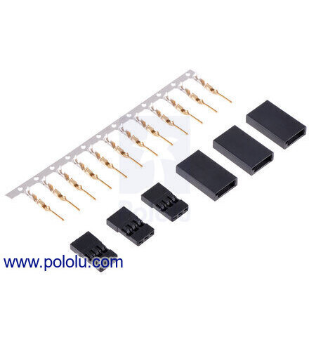 This pack contains everything you need to add up to three female JR connectors — the connectors commonly found on generic RC servos — to custom cables. You can use a crimping tool to attach the included pins to your own 22–26 AWG wires. This pack contains enough housings and crimp pins (including 3 spare pins) for 3 female connectors. The crimp pins have gold-flashed female contacts.