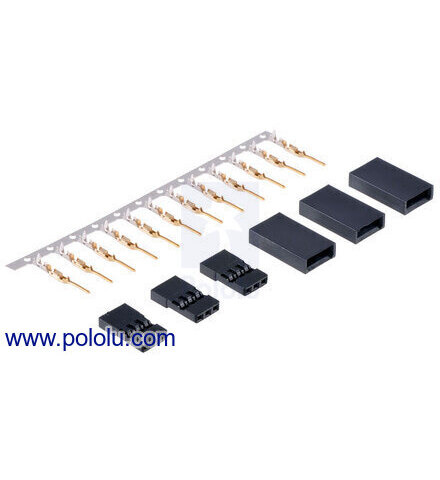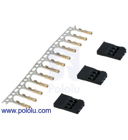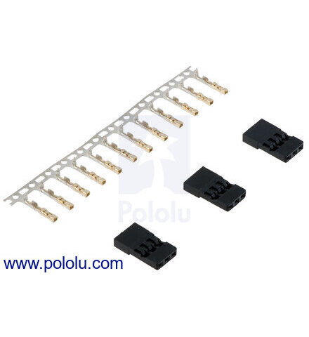 This pack contains everything you need to add up to three female Futaba J connectors — the connectors found on many Futaba servos — to custom cables. You can use a crimping tool to attach the included pins to your own 22–26 AWG wires. This pack contains enough housings and crimp pins (including 3 spare pins) for 3 female connectors. The crimp pins have gold-flashed female contacts.