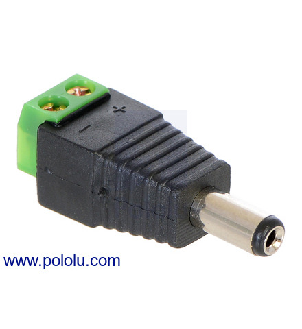 This connector adapts a 5.5 × 2.1 mm DC barrel plug to a pair of screw terminals spaced approximately 5 mm (0.2″) apart. The terminals are labeled positive and negative, with the positive terminal connected to the center contact.