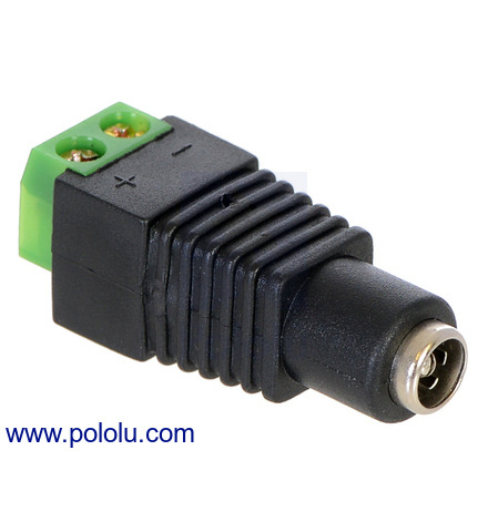This connector adapts a 5.5 × 2.1 mm DC barrel jack to a pair of screw terminals spaced approximately 5 mm (0.2″) apart. The terminals are labeled positive and negative, with the positive terminal connected to the center pin.