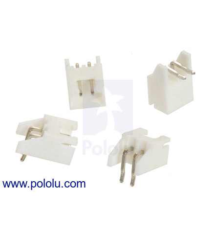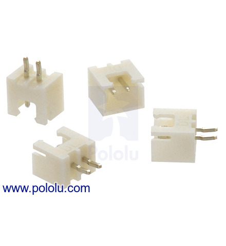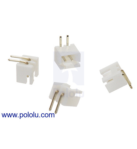 These shrouded, 2-pin JST XH-style male connectors have extended right-angle leads and match the female connector on the 2-pin female XH-style cable, and they also work with many other 0.1″-pitch female connectors, such as our female premium jumper wires. They are sold in packs of four units.