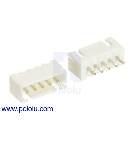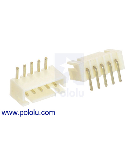 These shrouded, 5-pin JST XH-style male connectors have straight leads. They can be used with female JST XH-style connectors, and they also work with many other 0.1″-pitch female connectors, such as our female premium jumper wires. They are sold in packs of two units.