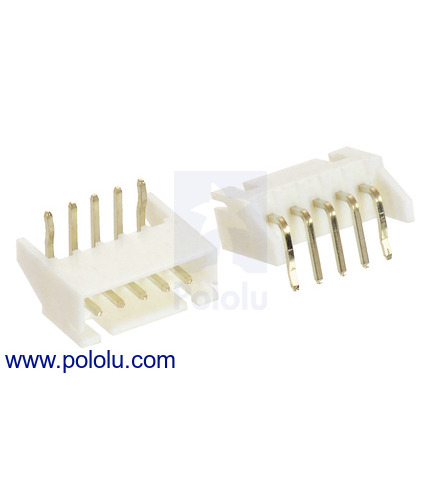 These shrouded, 5-pin JST XH-style male connectors have right-angle leads. They can be used with female JST XH-style connectors, and they also work with many other 0.1″-pitch female connectors, such as our female premium jumper wires. They are sold in packs of two units.