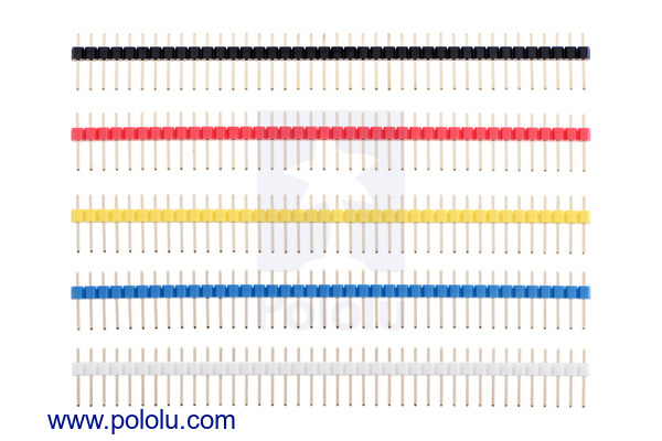 These 0.1″ (2.54 mm) male header pins are commonly used as low-cost connectors for perforated prototyping PCBs. The standard spacing is the same as on most solderless breadboards and matches standard 0.1″-pitch female connectors.