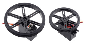 We have larger 70 mm and 90 mm sizes that are compatible with standard servo splines with 25 teeth and a 5.8 mm diameter and can be used with the following continuous rotation servos we carry: