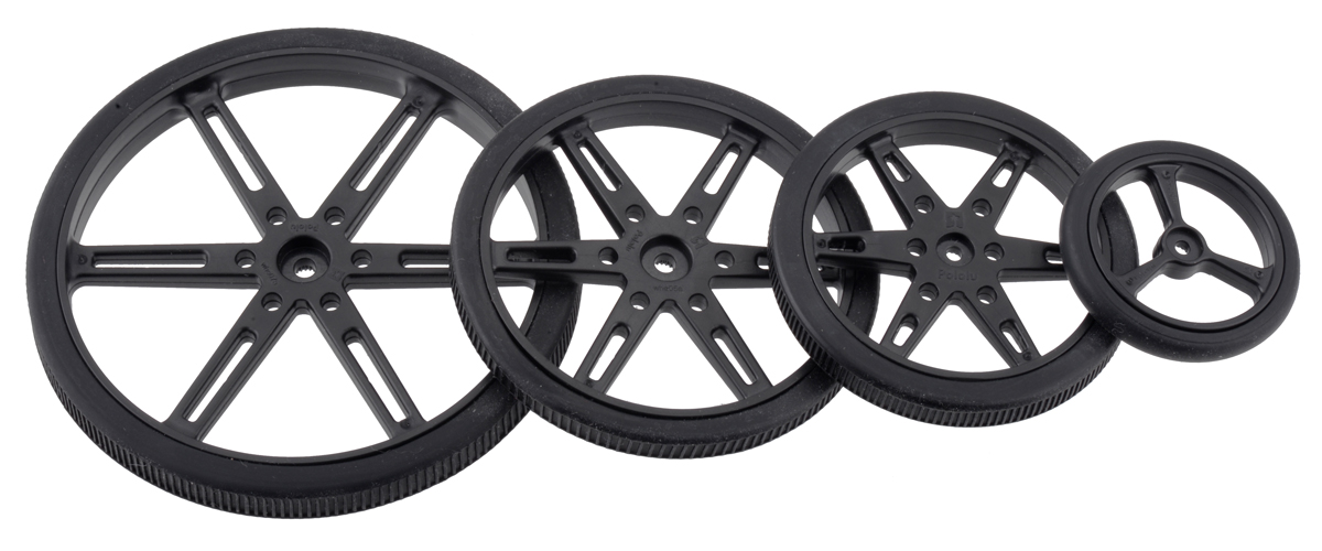 Black Pololu Wheels for Standard and Micro Servos – 90, 70, 60, and 40 mm diameters. |