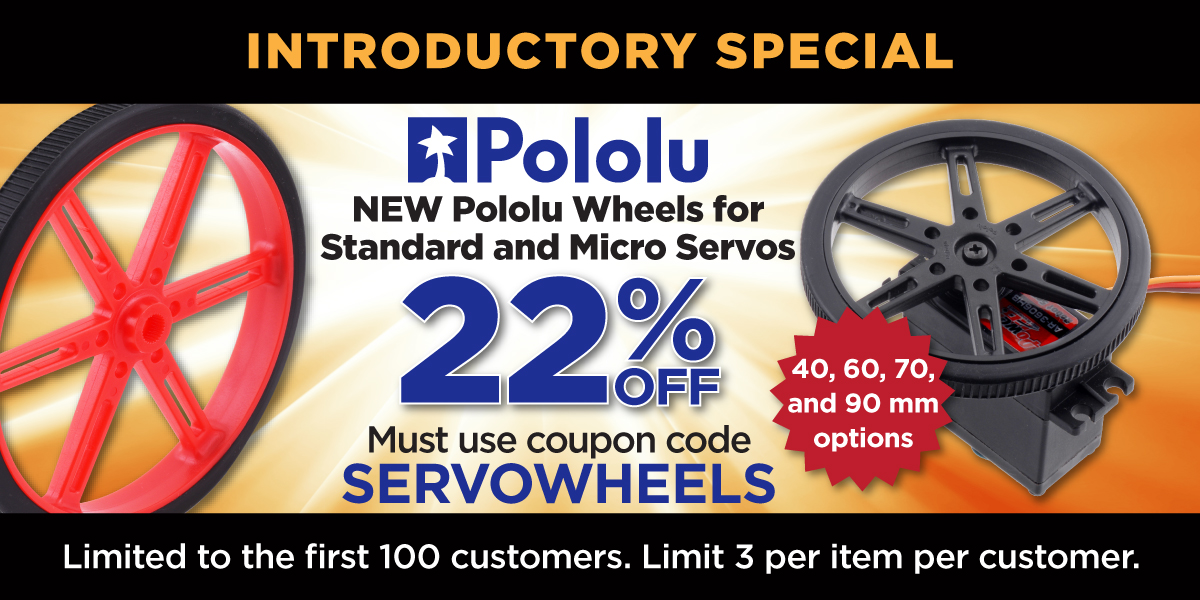 The first hundred customers to use coupon code SERVOWHEELS can get 22% off up to 3 pairs of each size! And, if you are one of the lucky ones not especially financially hurt by the pandemic and are interested in these wheels, please consider getting them without the coupon or even donating to help Pololu keep operating. We have set up item 2400 for donating in $1 increments.