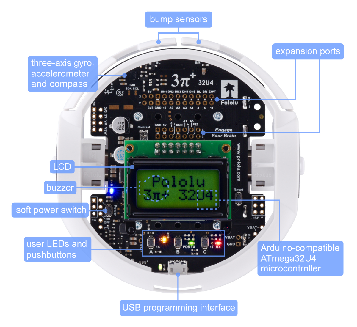 The 3pi+ delivered the most-requested feature missing from the 3pi, wheel encoders, along with many other improvements including a full IMU, bumpers, and programmability over USB (the 3pi required an external AVR programmer). With its support in the Arduino environment, the ATmega32U4 continues to offer a good entry point for working with microcontrollers, but the 8-bit architecture and 32 KB of program memory feel increasingly outdated and constraining, especially with the new sensors available on the 3pi+.