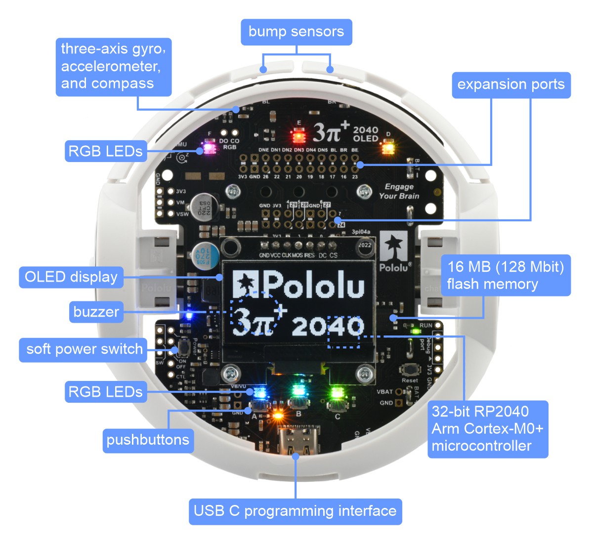 I am super excited to introduce our newest robot, the 3pi+ 2040. This robot combines the 3pi+ chassis, which we initially released in late 2020, with the power of the Raspberry Pi RP2040 microcontroller. Here is a quick overview of its features: