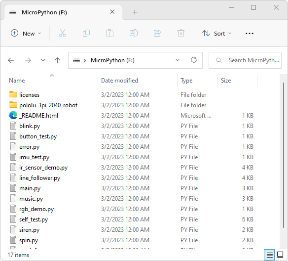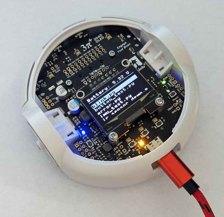 That brings us to the new 3pi+ 2040, powered by the Raspberry Pi RP2040 microcontroller (32-bit dual-core Arm Cortex-M0+) with 16 MB (128 Mbit) of flash memory. The robot ships preloaded with a MicroPython interpreter, so you can get started right away by plugging into its USB C port and editing the included example Python programs with your favorite text editor. No special programmers or programming software are required, and you can write MicroPython code from practically any desktop or mobile operating system as long as it has a text editor and the ability to copy files to a USB drive. For a basic Python IDE that lets you run code interactively, we are recommending the Mu editor. (See the User’s Guide for instructions on setting it up.)