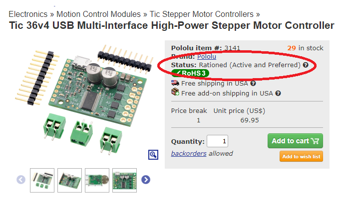 Non-electronics component and material costs are also going up, though those have generally been in the more modest 5% to 20% range, but shipping costs are up a lot, so that disproportionately affects heavier and bulkier items. We have had to reprice some of our stepper motors primarily because of the shipping costs to get them here, while we have thus far been able to avoid raising costs on our micro metal gearmotors (though volume discounts are smaller than they used to be). Most of our products involve at least some processing in the US, but we are able to ship some items directly from our China warehouse to other countries to reduce the impact of shipping costs and the tariffs on many products coming into the US from China.