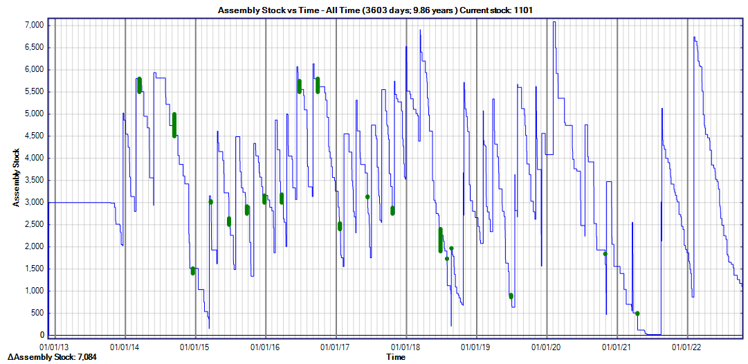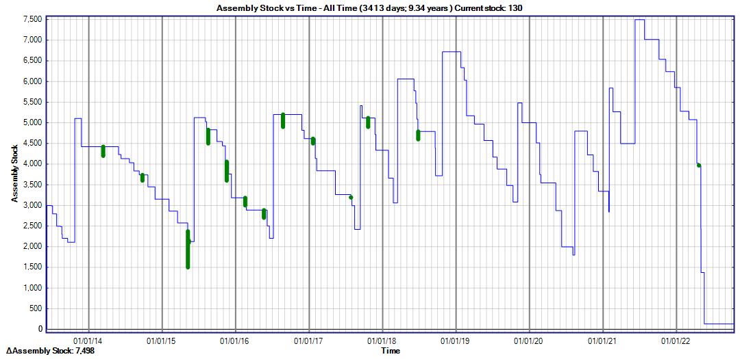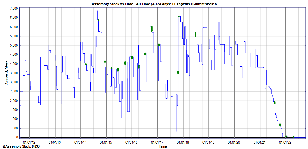 In the case of one important part I mentioned last year, we are still waiting for an order placed in late 2020 without having received anything since a partial shipment in March 2021! Here is what our internal stock chart looks like for that component: