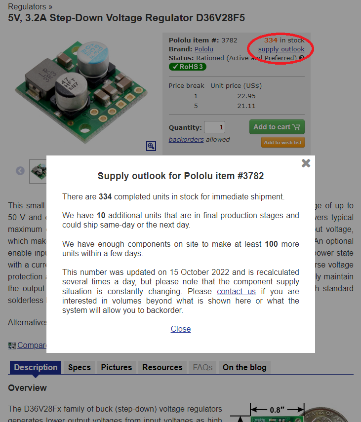The calculations of what we can make are quite complicated given that we have thousands of different components going into thousands of different products, and the products (and the associated inventory) can be in various stages of production. Components stop being available once they are soldered onto a board, but that board might still go through many more processing steps before being ready and available for sale. The in stock and “in final production stages” quantities should be spot on, but we variously round down the “enough components” estimate to keep it conservative. The numbers can be outdated quickly since we are selling and making products all the time, but we regenerate those numbers several times a day to be as up-to-date as possible.