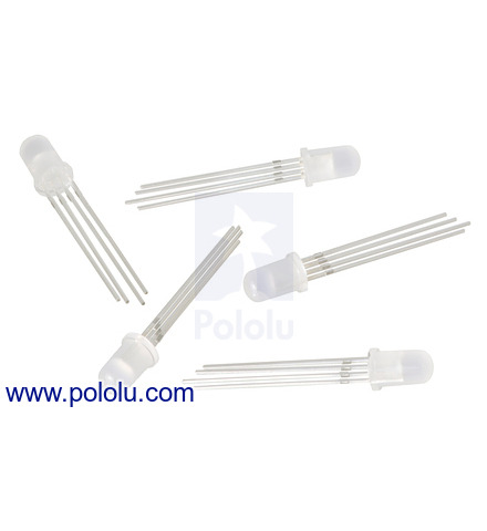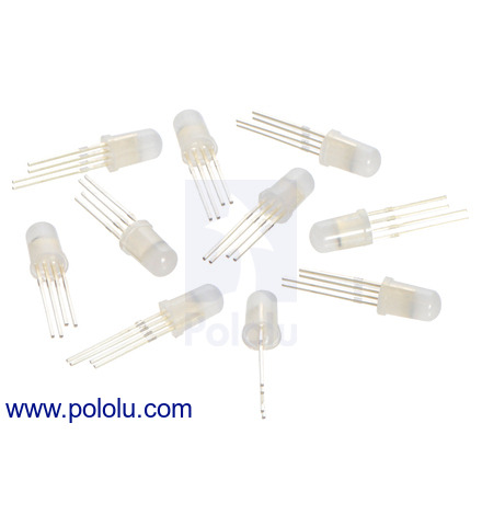 This 10-pack of 5 mm through-hole RGB LEDs offers an easy way to add colorful and complex lighting effects to a project. Each diffused LED features an integrated WS2811 driver that operates at 5 V and is controlled through a high-speed one-wire digital interface that allows multiple LEDs to be connected together to form a chain of addressable RGB LEDs.